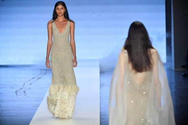 Tecidos nobres como seda pura, chiffon e organza foram moldados em formas assimétricas, godês e babados, junto a tules, plumas e rena chantilly.
