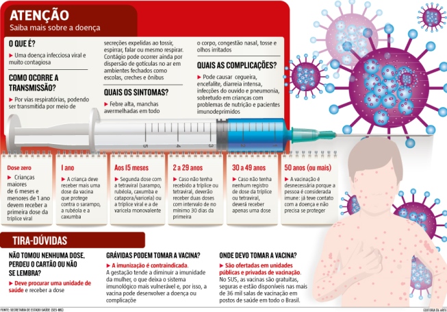 “Estão susceptíveis à doença as pessoas que não foram vacinadas conforme o calendário básico, independente da idade. Portanto, todos que pretendem viajar e não possuem as doses necessárias devem receber a tríplice viral 15 dias antes da viagem para sua completa proteção e de seus familiares”, afirma o coordenador de Doenças e Agravos Transmissíveis da Secretaria de Estado de Saúde (SES), Gilmar Coelho.
